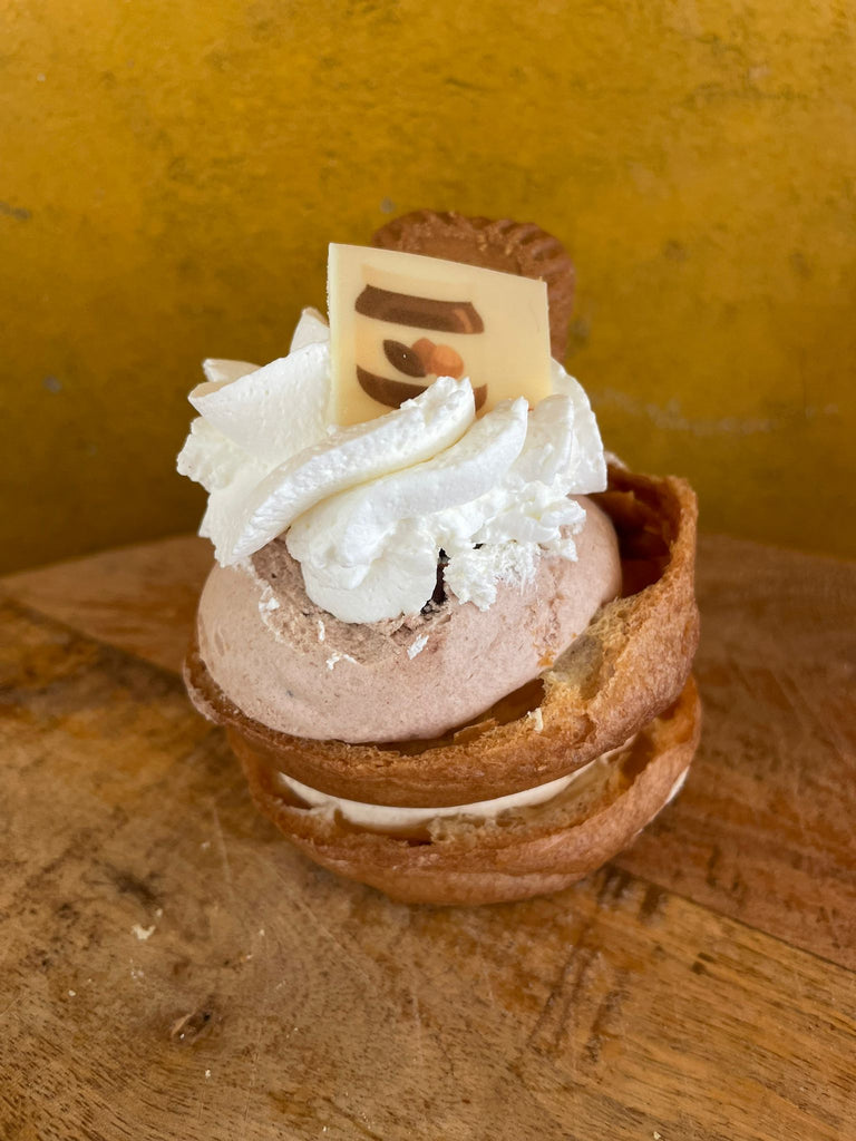 Een interieur van Nutella, gevuld met een mix van een bavaroise van Biscoff speculoos en een bavaroise van Nutella, afgewerkt met een Lotus koekje