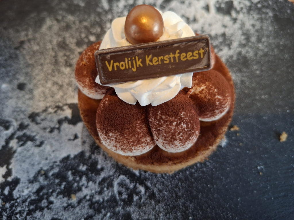 Een slofje met mascarpone, interieur van lange vingers in koffielikeur en tiramisu bavaroise en afgewerkt met slagroom en deco voor een extra feestelijk tintje.. Die moet je geproefd hebben!