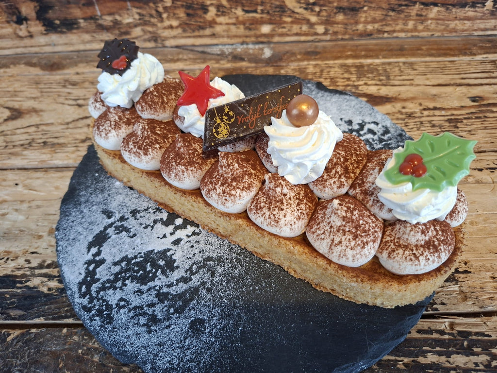 Een slof met mascarpone, interieur van lange vingers in koffielikeur en tiramisu bavaroise en afgewerkt met slagroom en deco voor een extra feestelijk tintje.. Die moet je geproefd hebben!