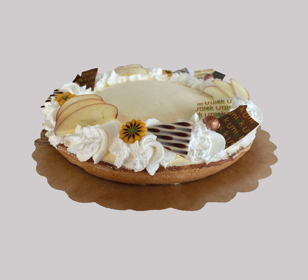 Limburgse roombodem gevuld met een variatie van dagverse appels gemengd met citroen, opgemaakt met een laag banketbakkersroom krokant suikeramandelen en rozetten.